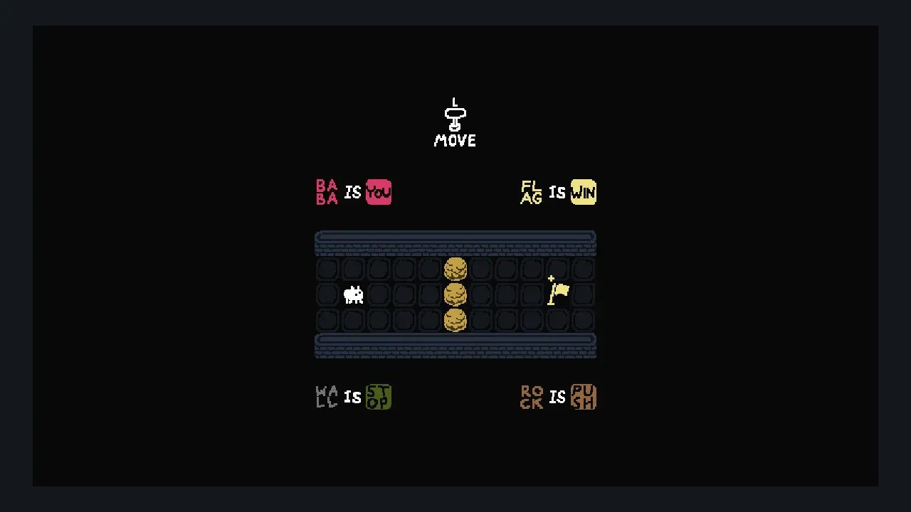 Every word on the screen is a movable tile. So, as the Baba, I can push the “Win” tile around the stage, changing “Rock Is Push” to “Rock Is Win.” Now I can complete the puzzle by touching the rock.