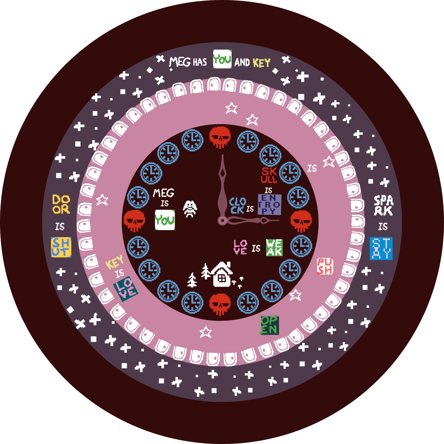 Because Meg has You, this also reveals a new icon for You, so that I can keep working on the puzzle even after Meg is Gone. Okay, but what is You now? I don’t know what icon will revealed when Meg is broken into pieces. I haven’t played this level yet. In 14 years, or more, or less, I guess I’ll find out. So Whatever is You pushes the heart to the door and touches a Spark, which is Stay.