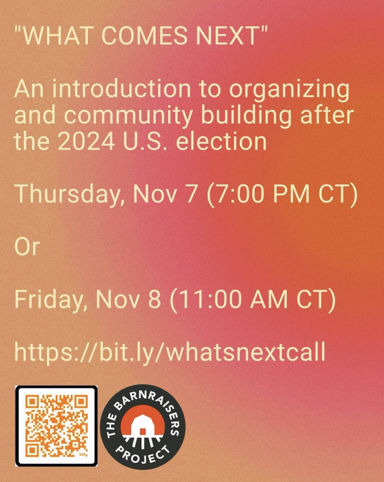 Hey friends. One of the things that I love in the midst of this difficult moment is that there have been and will be no shortage of calls and meetings helping bighearted folks channel their rage/heartbreak about the 2024 election into action. This is one of those spaces. It likely won’t be massive, and isn’t affiliated with a big name left-leaning org. What it will be is a relatively short (hour long) offering about how to think about your next steps in your local community and how those steps can both keep your neighbors safe and help fuel larger efforts for a kinder country and world. The vibes will be purposeful but warm, and you’re welcome even if (especially if) you’ve never organized before.