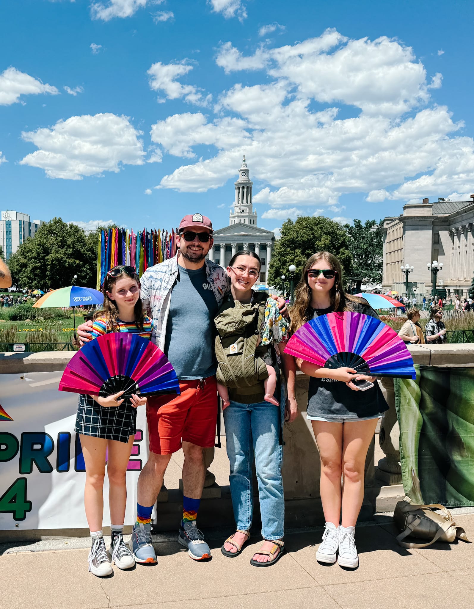 Lindsay's oldest kid stayed home to babysit some of the younger kids. The rest of the group went to Pride in two cars. Lindsay drove Viola and one of her sons. Daniel drove Jessie, their baby, Margaret and Margaret's friend. Throughout the day, Daniel and Lindsay sent me pictures of the girls.