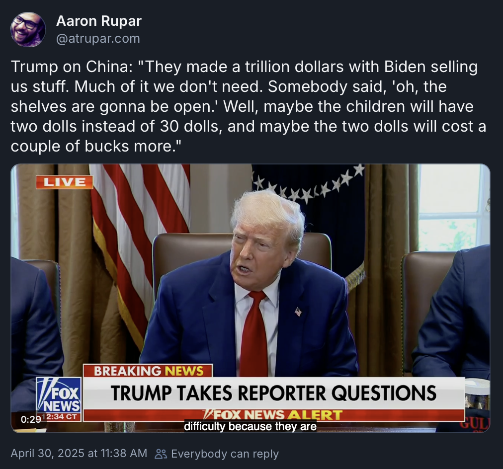 Today, Trump defended his tariffs by making a bunch of false claims. He then talked about our kids. Like these idiots cannot stop doing evil monologues about our children! It's wild! Anyways, Trump talking about China said,