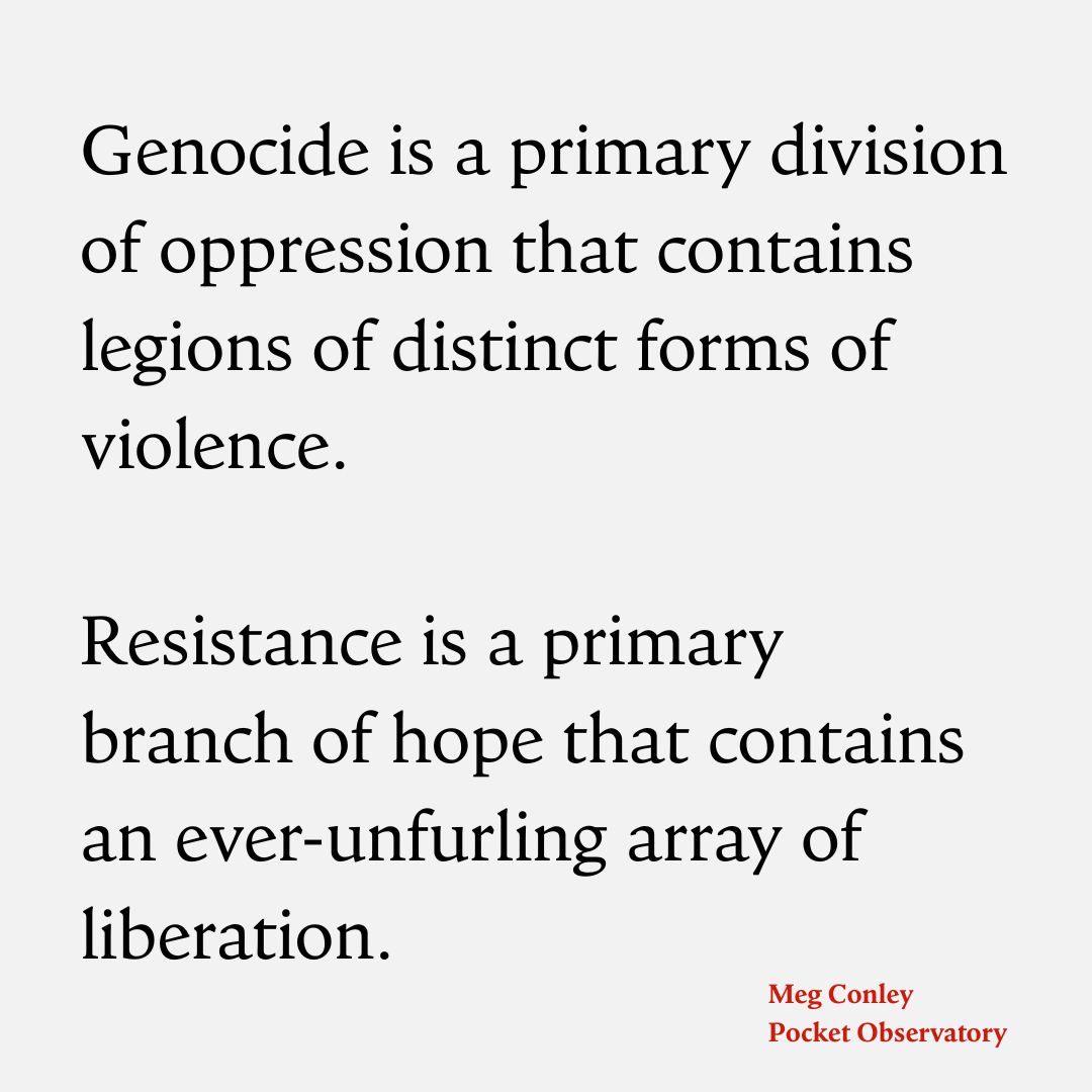 Genocide is a primary division of oppression that contains legions of distinct forms of violence. Resistance is a primary branch of hope that contains an ever-unfurling array of liberation. Monkman works at a scale large enough represent both systems.