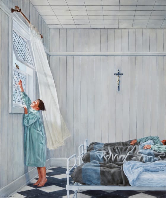 An Indigenous child reaches for a bird perched on a windowsill, just out of reach—as were the freedoms to move, think, speak, and be Indigenous. This work presents a stark and haunting representation of the cold loneliness of Indigenous children in boarding schools, yet it also honors the hope and resilience of those children, now Elders, who survived and became knowledge keepers. The Sparrow poignantly calls for truth-telling and repair far beyond the European drive to possess and hoard. - Kent Monkman: History is Painted by the Victors Exhibition Guide