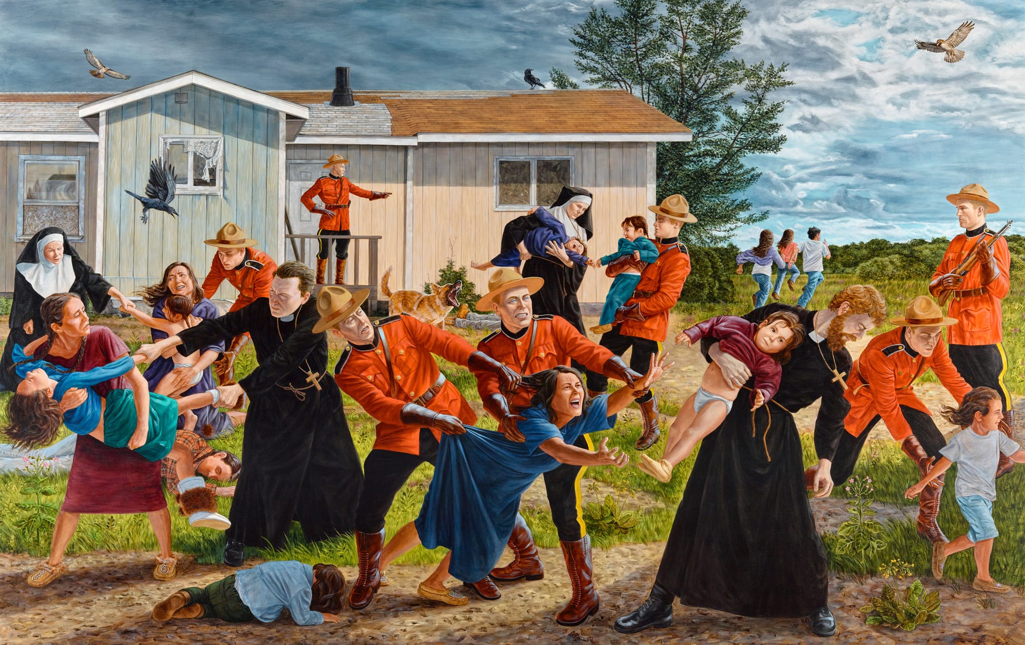 Monkman collapses time and space to dramatically tell the history of more than 100 years of forced removal of First Nations, Métis, and Inuit children from their families and communities by the Royal Canadian Mounted Police and Roman Catholic, Anglican, Methodist, United, and Presbyterian churches. The experience of tens of thousands of Indigenous children within hundreds of residential schools in Canada and boarding schools in the US was shattering and horrific. The language loss, cultural isolation, mentorship disruption, intergenerational trauma, and more are still felt today. - Kent Monkman: History is Painted by the Victors Exhibition Guide