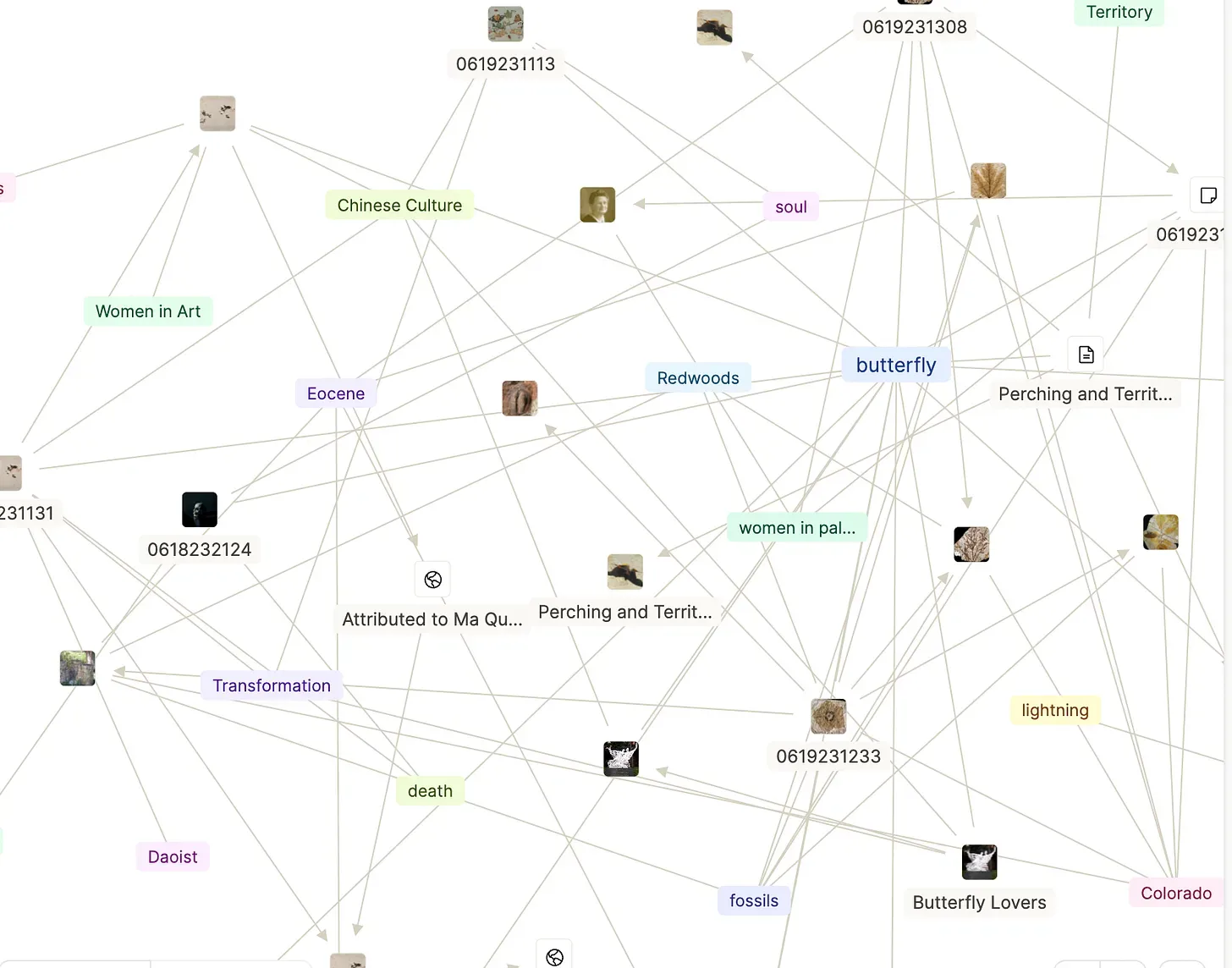 Here’s an example of connections made through the notes I took for an upcoming newsletter about butterflies. Well, part of the newsletter is about butterflies. These are the notes for that part. Each point is longform writing, a note, a pdf, academic article or image. Watching it expand is just so damn satisfying. (The expansion happens like one second in.)