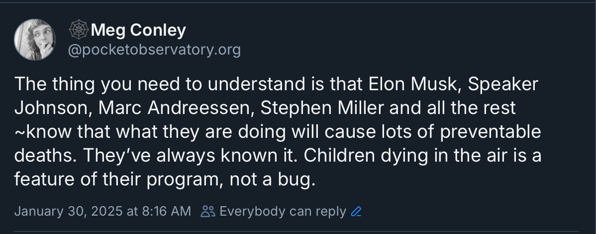 And you betcha, Elon-orchestrated negligence is knocking planes full of children from the sky. And yep, Trump blamed Black people and women for the plane crash instead of the Nazi saluting billionaire who forced the head of the FAA out just a few days before the crash. And certainly, our children's privacy is being grossly violated in a Musk-directed trans-panic witch hunt.
