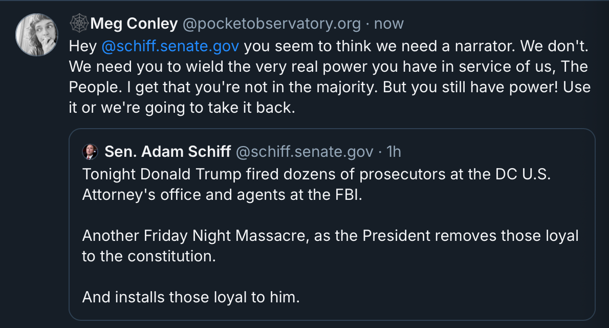 And yes! It appears almost every single Democrat has decided to just let it all happen while uttering mild sighs of dismay. Adam Schiff just keeps narrating the coup? Thanks, Adam. Now go do something.