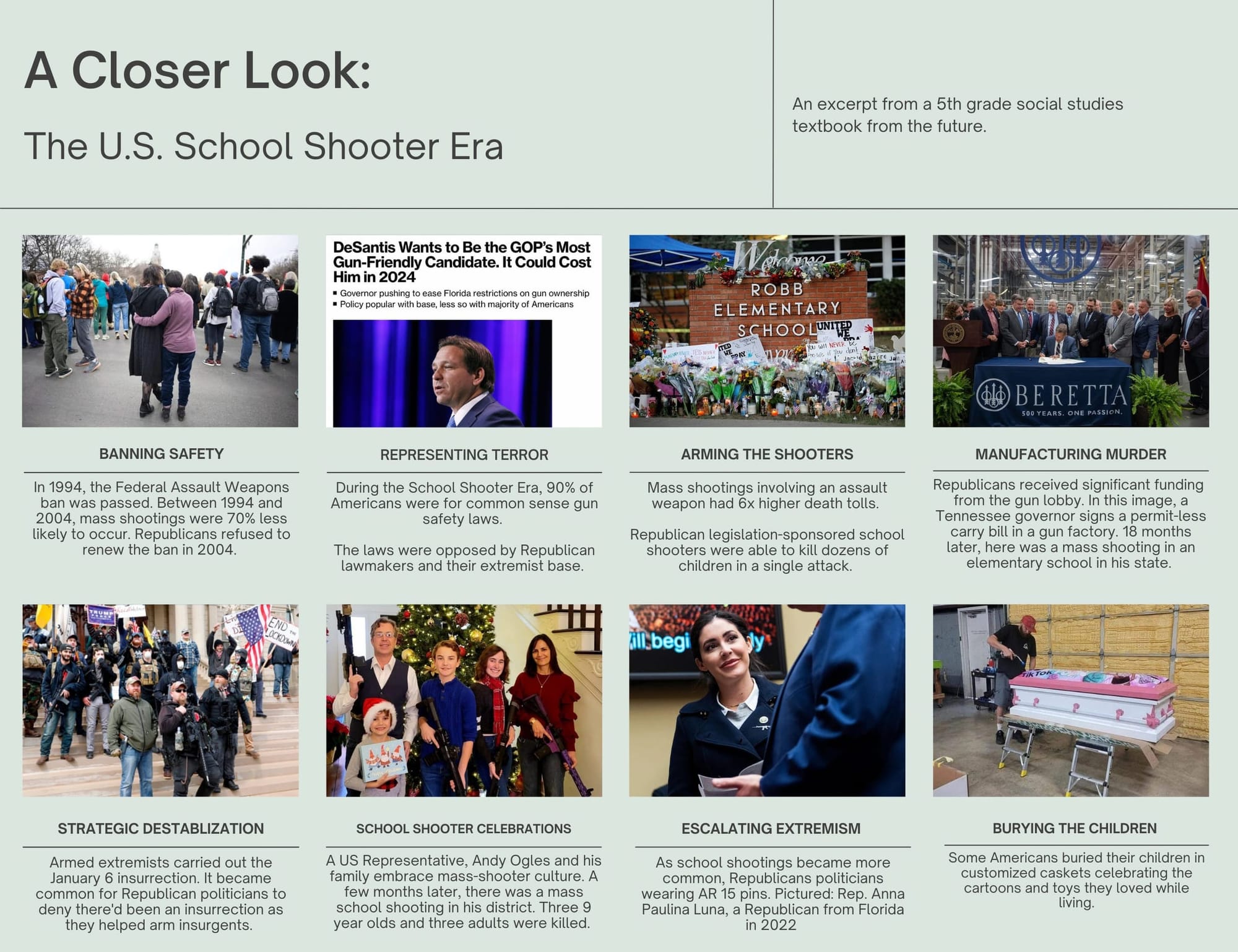 100 years from now, there will be a section in U.S. textbooks about The School Shooter Era. The horror, the dead children, the bullet proof backpacks and active shooter drills will be explained in a couple paragraphs. It will be easy enough for a fifth grader to understand. Here is what it will say....read the rest here.