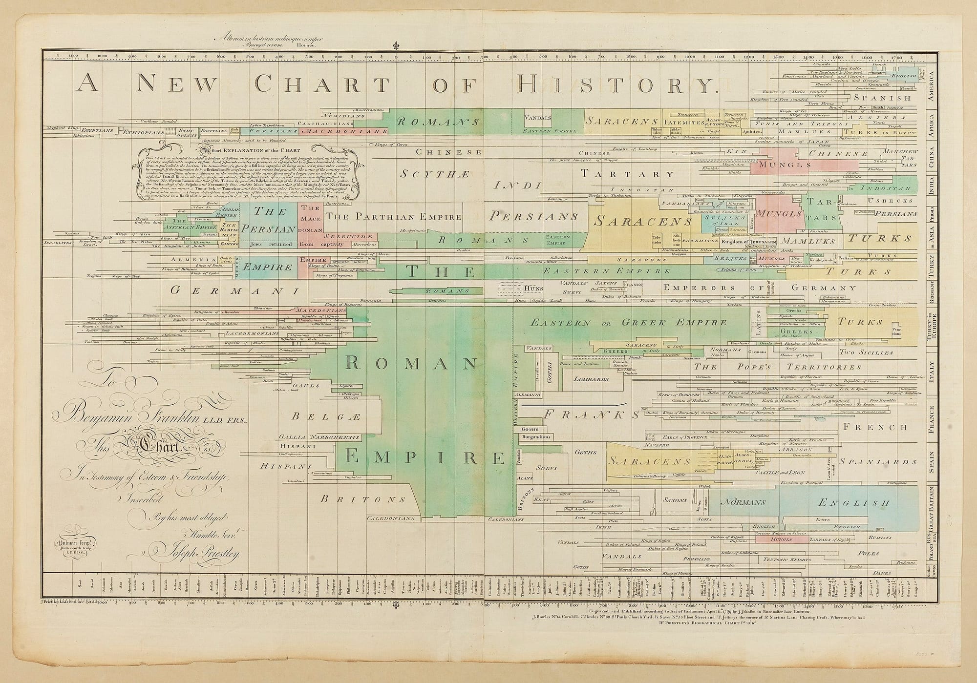 Priestley believed the course of history was set by God’s benevolent will. History is plagued with war, hunger and well…plagues. No mind. Priestley wrote that even “apparent disasters are, in fact, often favourable to the general progress of mankind.”1 He hoped his Chart would help people understand the divine direction of history through “the idea of a measurable space…a line.” Once the space was measured, people began to fill it.